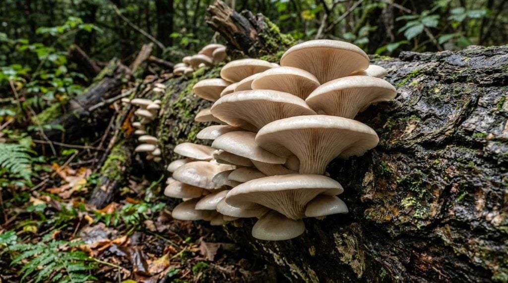 Grows at the base of oaks (and sometimes other hardwoods) in large, layered clumps of overlapping gray-brown caps. Another edible, highly prized one. But its presence at the base of a tree indicates root rot, which is a structural concern regardless of how the canopy looks.